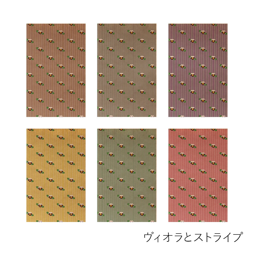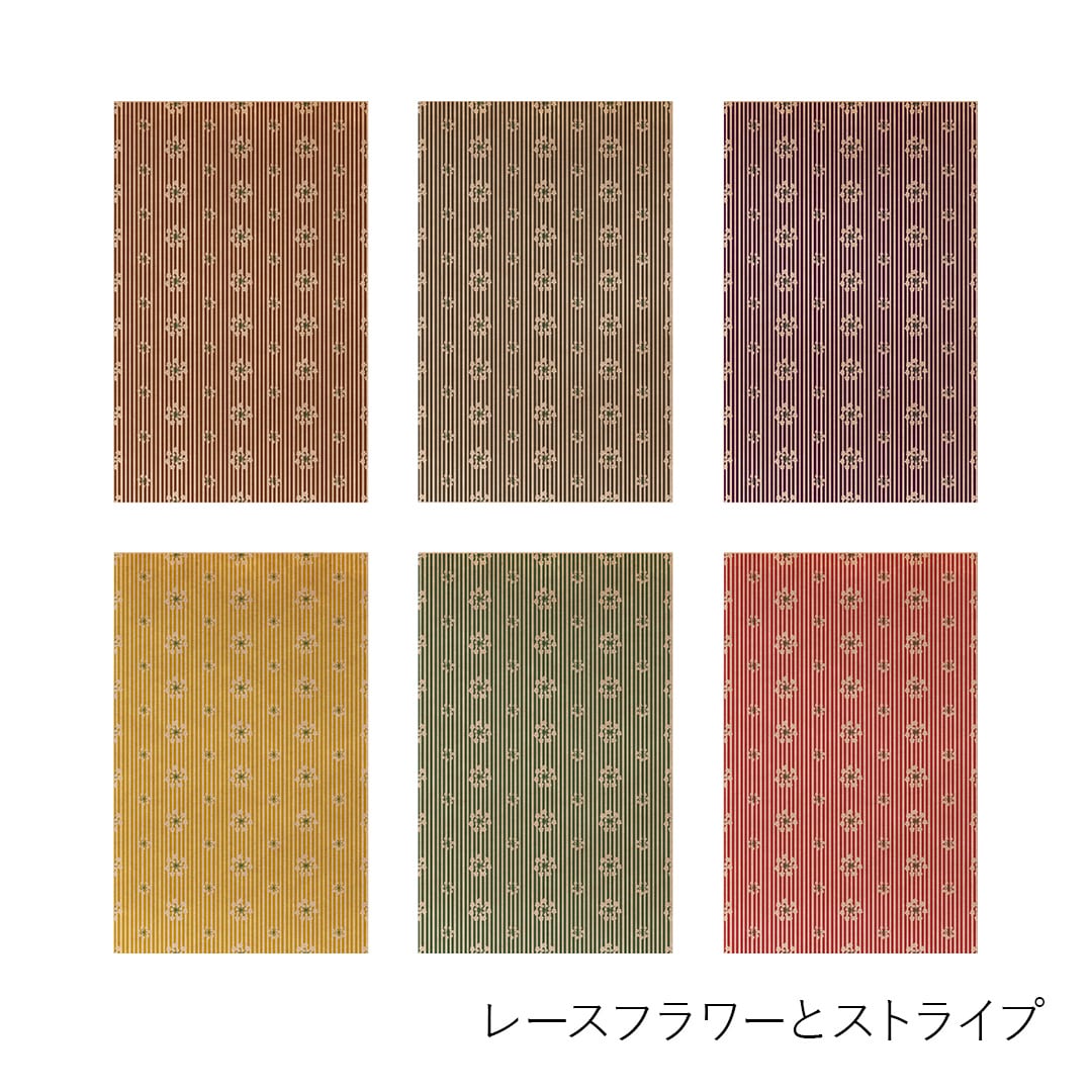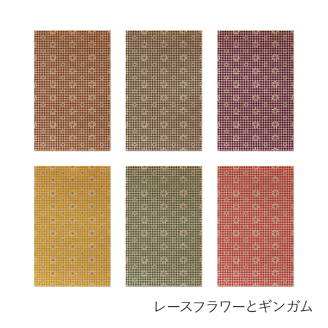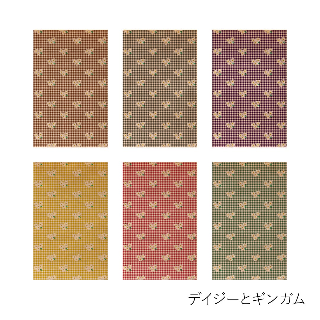 8種類のパターンがそれぞれ6色(灰色・茶色・紫色・芥子色・緑色・赤色)各1枚ずつ全48枚入っています。パターンは、M6サイズをはじめ小さな手帳やノートにも使いやすい柄の大きさでデザインし、色味は布や洋服に使われるような配色をイメージして展開しています。