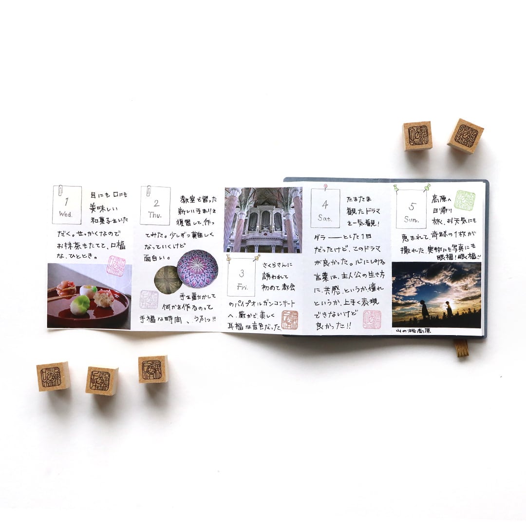 手帳やノートデコやコラージュの素材、日記など文章だけで残す記録の片隅に押しても誌面をキュッと引き締めてくれます。