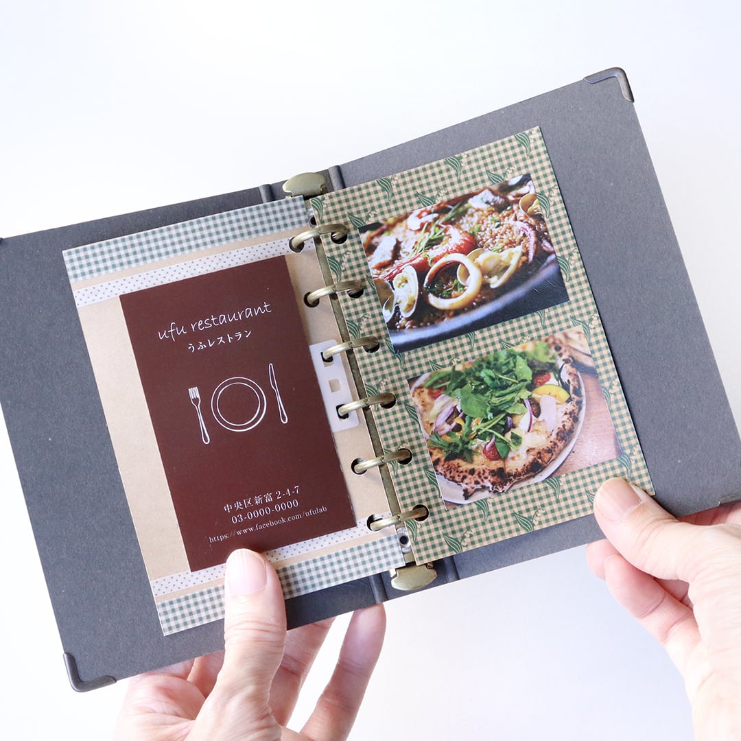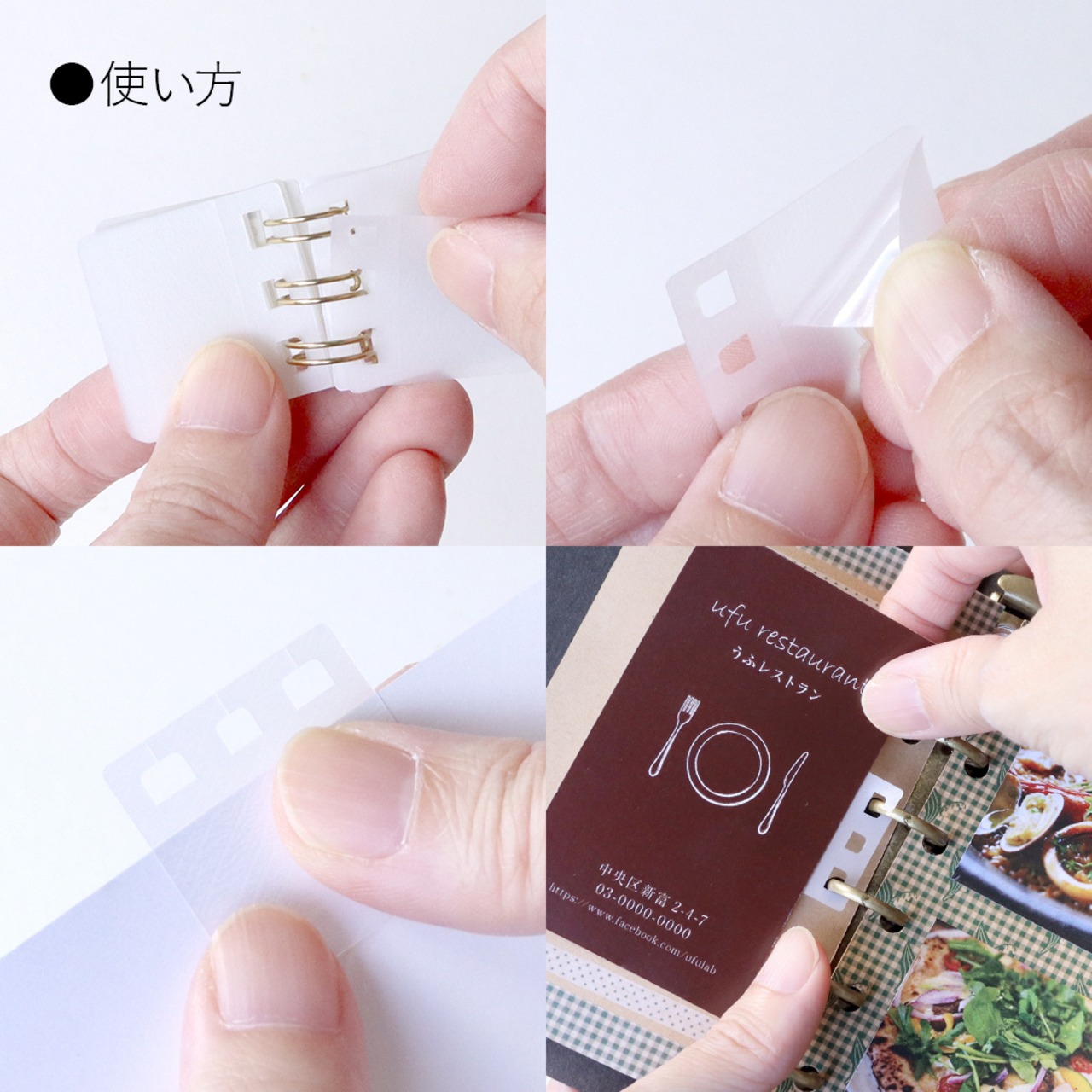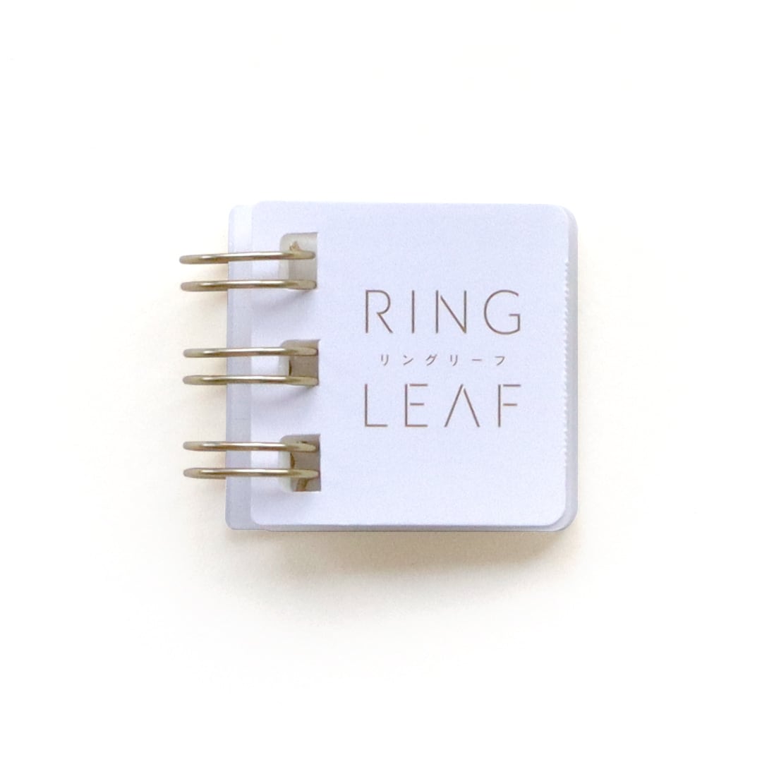 「リングリーフ」は、リングノートにまとめたい紙ものをパーツの粘着面に貼りつけて、パーツのリング穴をノートのリング部分にはめるだけで、簡単にセットできます。糊付けしたくないショップカードやフライヤーなどの紙ものを、ノートのレフィルを追加するようにすっきり保管できます。