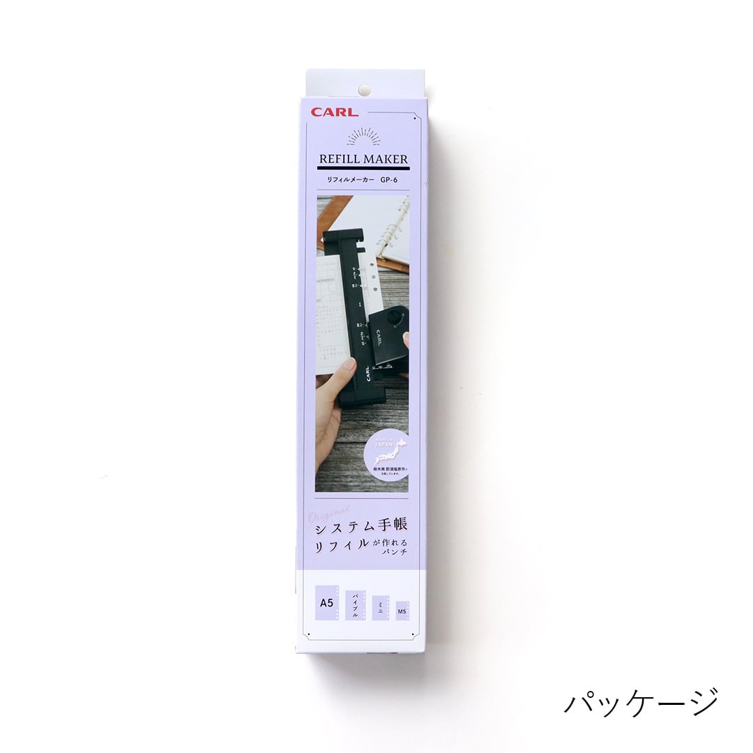 カール事務器の「リフィルメーカー GP-6」は、パンチ部の凸をゲージ部の凹に合わせてパンチするだけの簡単な操作で、手帳用のリフィルを作ることができます。
