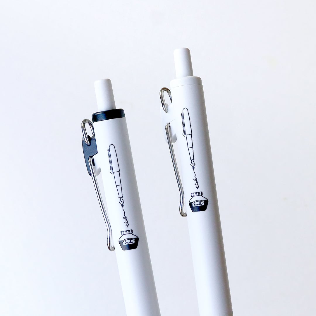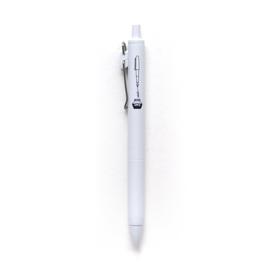 「ユニボール ワン 白 万年筆とインク」は、三菱鉛筆のuni-ball one(ユニボール ワン)の「ユニボール ワン クリエイティブカラー 」シリーズ「ユニボール ワン 0.5㎜ 白」の軸に、+lab(プラスラボⓇ)のオリジナルイラストをデザインした、ゲルインクボールペンです。