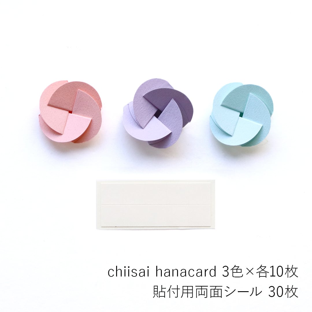 「chiisai hanacard(ちいさい花カード)」は、立体的な花の形のちいさなメッセージカードです。付属の両面シールを使えば、ギフトボックスやギフトバッグなどに貼ってメッセージを添えることができます。また、色紙やカードにメッセージを書いたhanacardを集めて貼れば、寄せ書きをつくることができます。