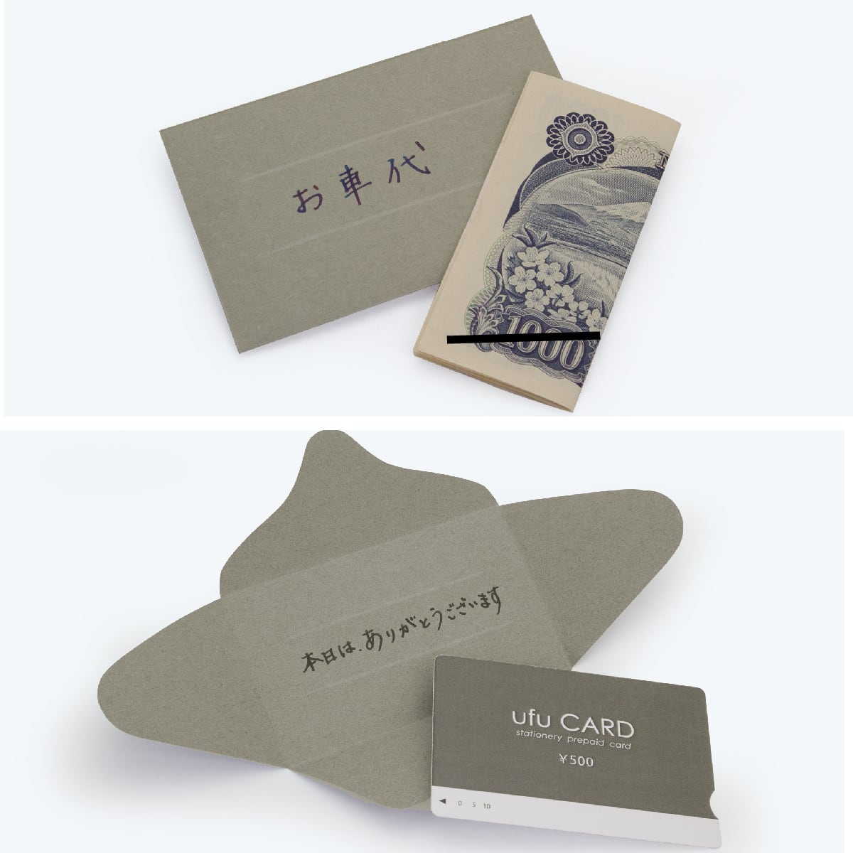 「chiisai futocard(ちいさい封筒カード)」は、、カードと封筒がひとつになった封筒がいらないメッセージカードです。名刺くらいの大きさで、ひと言そえるためのメッセージカードとして便利なサイズです。心づけやお車代、プリペイドカードやギフトカードを贈るときにもひと言添えて、お金やカードなどを金封のように包んで渡すことができます。