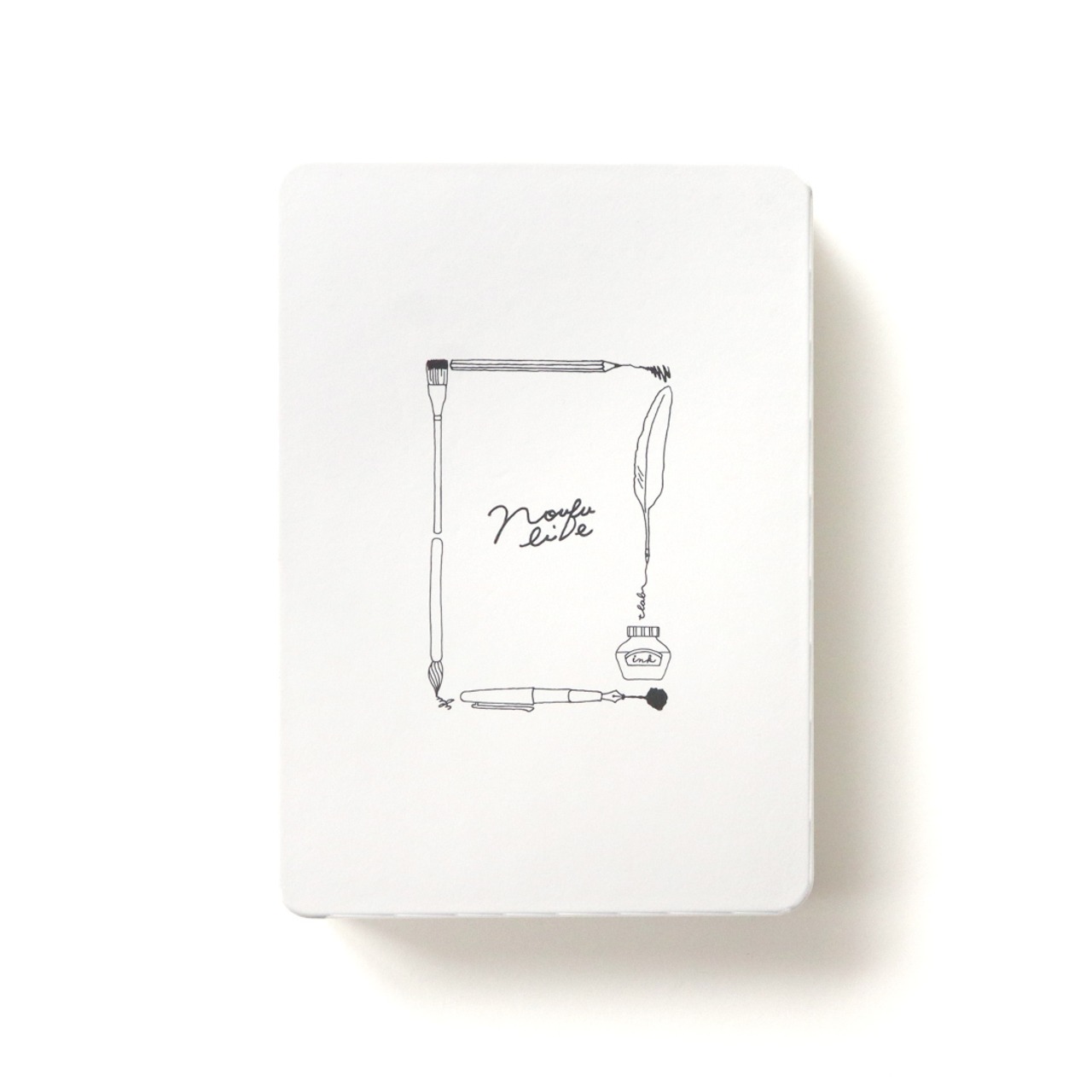 パルプモールド(パルプを専用の型で立体的に成型した製品)でつくった真っ白な箱に、オリジナルのイラストを印刷しました。イラストは、筆記具とインクに「No ufu No life」の言葉をロゴのようにデザインたもので、小物入れとしてもお使いいただけます。