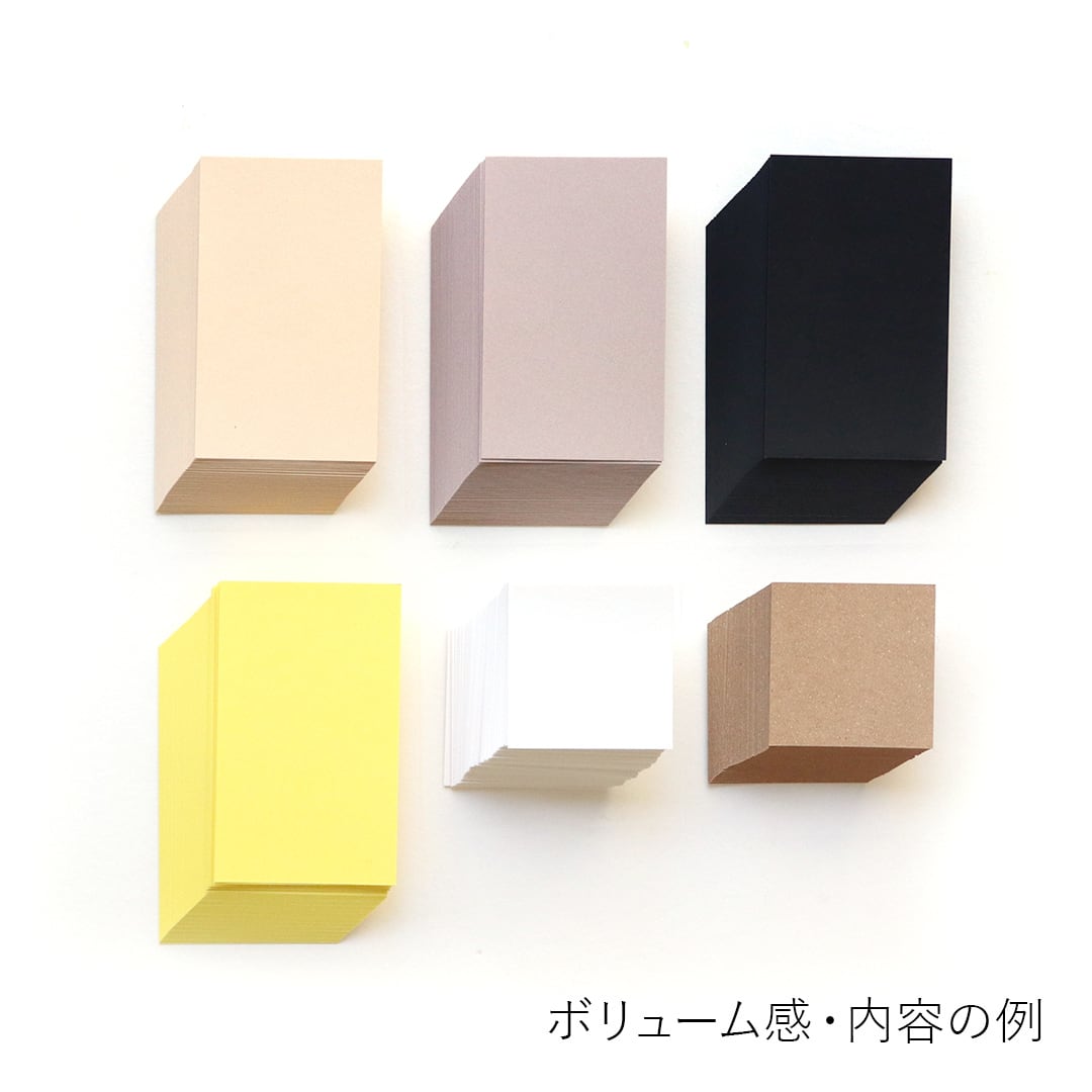 9.1×5.5cmサイズの紙4種類と、4.9×4.9cmの紙2種類がそれぞれ50枚程度入って(画像参照)、合計250枚とちいさい紙をたくさん詰め込みました。どの紙もメッセージカードとして使えるくらいの厚みのあるしっかりとした紙です。素材感も紙質も違う6種類の紙をお楽しみいただけます。